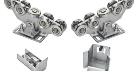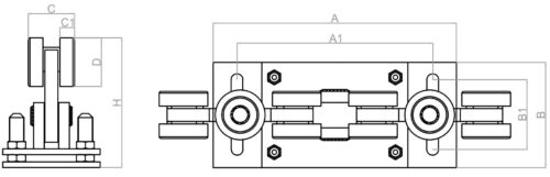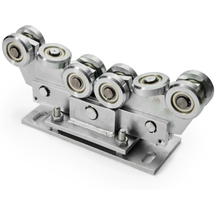 Wózek jezdny 10 rolkowy do profilu 80x80x5 mm. Wózek posiada regulację w pionie oraz poziomie, wahliwy.